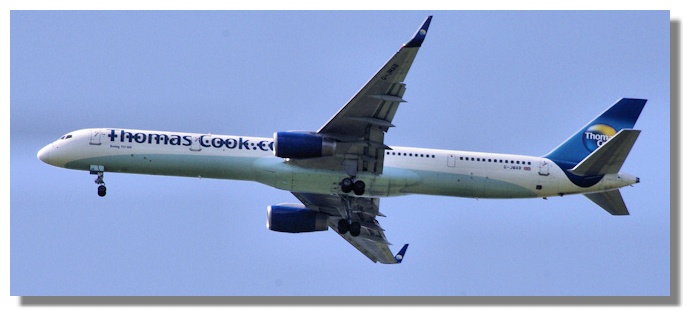 The poor summer (again) will have increased the number of Scots taking package holidays to warmer and sunnier parts of Europe. Travel agent Thomas Cook used to engage the services of other aircraft operators but now employs its own aircraft and crews to provide the service. This Boeing 757 aircraft is flying at under 2,000 feet at this point on its approach to landing at Glasgow airport.
