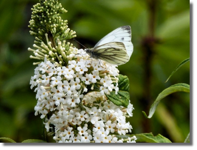 There are two small white butterflies in the UK - the simply named "Small White" and the "Green Veined White". In flight and from the top, it is almost impossible to identify which one it is. But the Green Veined variety has these clearly defined "veins" under its wings. When completing surveys for the Butterfly Conservation Society the organisation accepts the reality and unless a positive identification like this can be made, is content to have reports of numbers of "small whites".