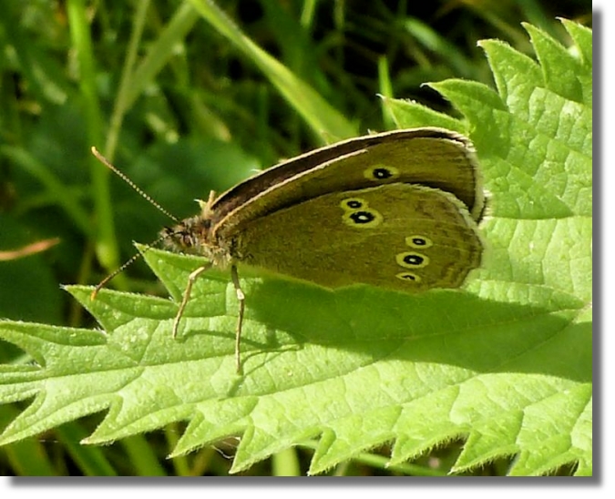 With its wings edged in silvery white and its distinctive ringed eye spots under the wings, the Ringlet is easily recognised, despite its overall brown colour. These small circles on the underwings, which give the butterfly its name, vary in number and size and may be enlarged and elongated or reduced to small white spots and occasionally they lack the black ring. The eye spots apparently confuse predators as to the position of its body. The upper sides of the wings are a sooty brown with small black eyespots. Wingspan is around 5 centimetres (2 inches). The Ringlet can be seen from late June to mid-August, flitting across fields of grass. It is one of the few butterflies that flies in dull and overcast weather. With many butterflies in decline, it was a surprise to find five Ringlets within 15 minutes at Drumpellier.