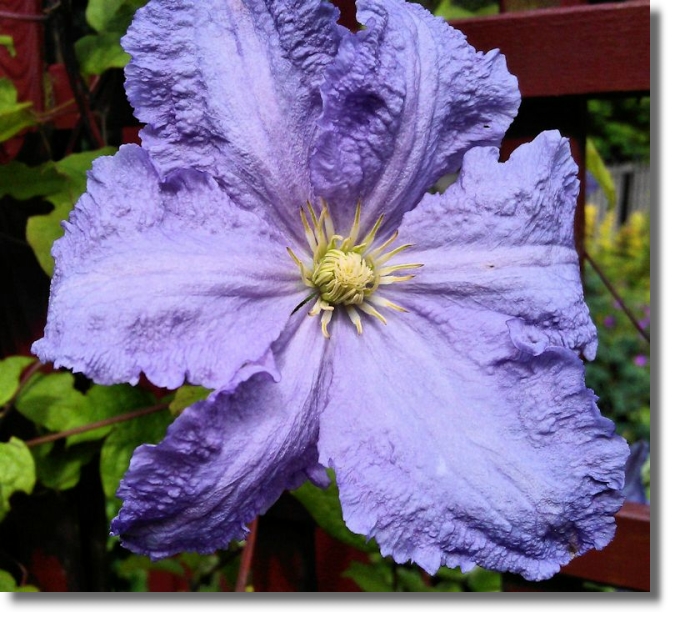 Clematis flowers come in all shapes and sizes and this large purple variety climbs to over six feet up a trellis at the entrance to the garden (shown above at the start of this section of the diary). The flowers are 4 to 5 inches across.