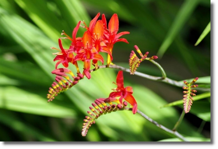 Crocosmia is a small family of flowering plants in the iris family. It is native to the grasslands of Cape Floristic Region of South Africa. They grow from basal underground corms in vertical chains with the youngest at the top and oldest and largest buried most deeply in the soil. If the chains get disturbed and broken up the corms just continue to grow allowing species to become invasive and difficult to control in the garden. They are commonly known in the United States as coppertips or falling stars, and in the United Kingdom as montbretia.