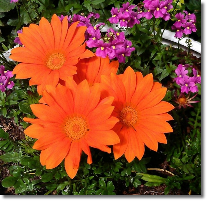 Gazanias, originally from South Africa, are grown for the brilliant colour of their flower which appear in the late spring and early summer. They prefer a sunny position and are tolerant of dryness and poor soils. One disadvantage of this plant is that the flowers open up in sunshine - a commodity not often seen in Scotland! These brilliantly coloured annual plants are being grown in a container along with some pink Nemesia.