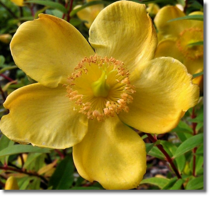 Hypericum calycinum is an evergreen flowering shrub native to southeast Europe and southwest Asia, which is generally referred to in British and Australian English as "Rose of Sharon". The bright yellow flowers bloom for a lengthy period in the summer and so are popular with gardeners. It is also the national flower of South Korea. The nickname "Rose of Sharon" indicates that the plant was originally (and erroneously) thought to originate from Syria. The flower's name in Korean means "immortal flower" and has been loved by Koreans for thousands of years.