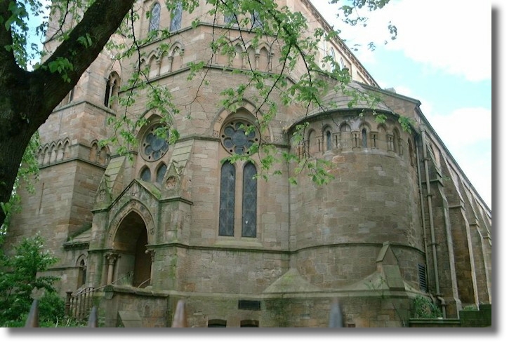 Ňran Mór is Gaelic for 'great melody of life' or 'big song". The spire of the church (not visible in this view) is described as an Italian Gothic Pyramid and is said to be the first to show a markedly foreign influence in Glasgow.