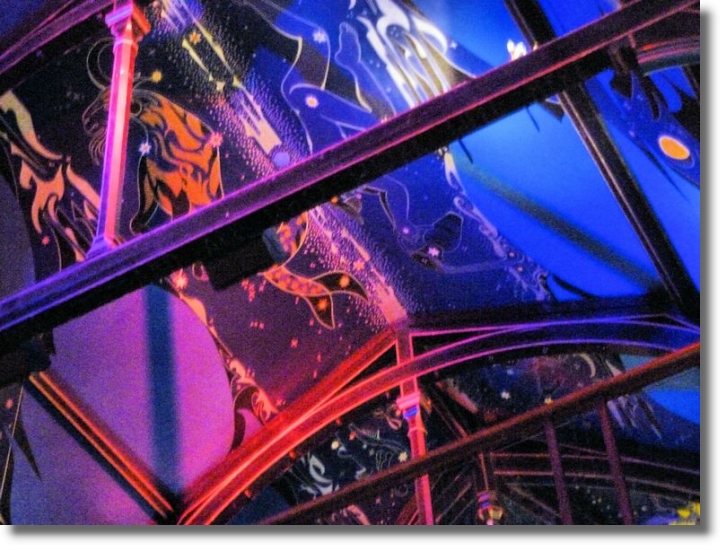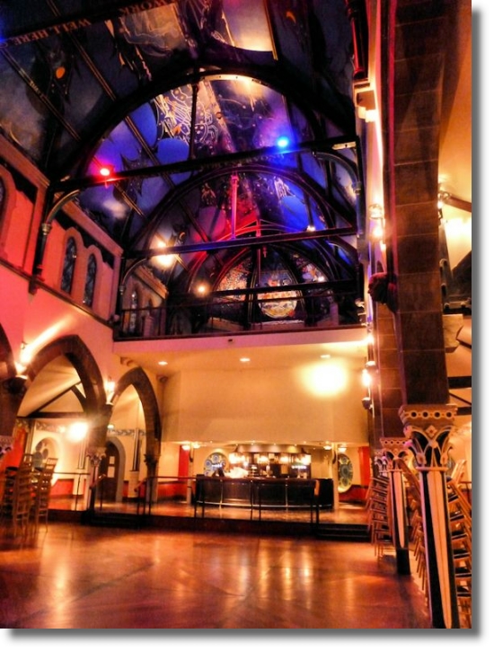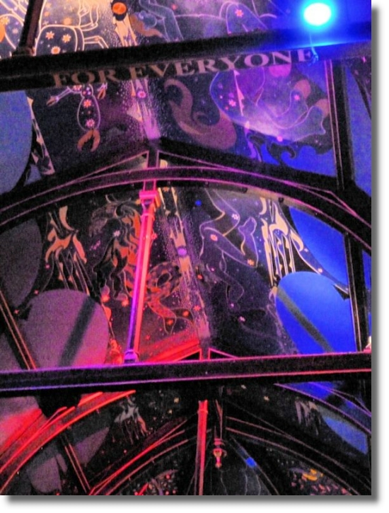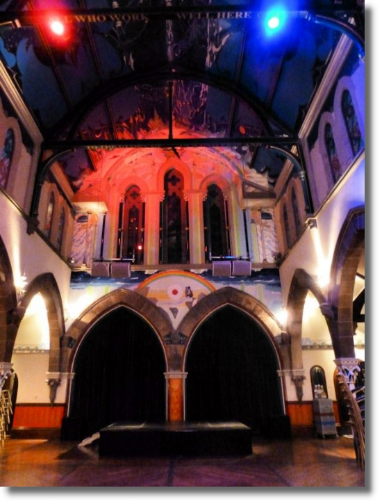 I had the opportunity last month to meet up in Ňran Mór with John and Beth, email friends from Texas (though John was originally from Glasgow). During the course of a pleasant evening there I asked one of the staff if I could take some photos of the auditorium which has understandably gained a great reputation over recent years. I was duly escorted upstairs in a small lift to the impressive auditorium where the lights were turned on just for me! The auditorium was originally the upper part of the church, with the bars and restaurant below on the ground floor. The well-known Scottish author and artist Alasdair Gray has been working for nearly ten years on creating incredible murals on the walls and ceilings representing "the celestial universe" with stars, the planets and phases of the moon. The murals have had praise from such diverse people as art impresario Richard Demarco and the late pop singer Amy Winehouse (who described the room as one of the most beautiful she had ever seen).