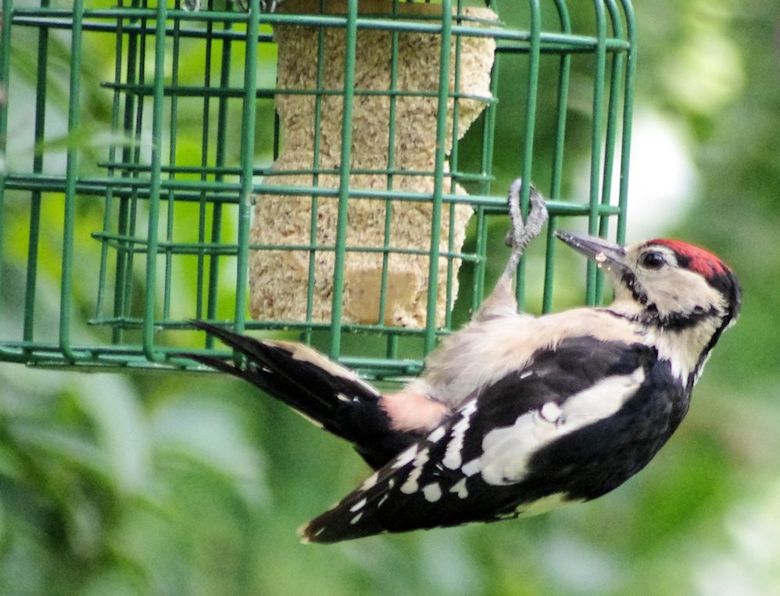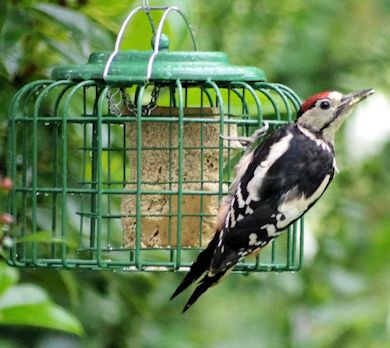 The red crown indicates that this Great Spotted Woodpecker is a young one - the adult male has red feathers at the nape of the neck and the adult female is black there. That red crown will moult over the next few months and the adult plumage will then appear. It is apparently not uncommon for woodpeckers to come in to suburban garden feeders. Of course, the typical drumming sound of woodpeckers is totally absent when attacking the soft nut cake!