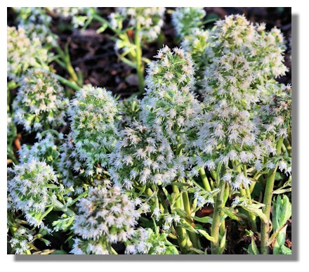 I've seen this carpet of white flowers before at Finlaystone Country Park and despite scouring books on wild flowers, have never found out what it's name was. This time, I asked at the visitor centre - and found that others had been asking the same question, so they were able to tell me that it's a "Butterbur". Another common name for many species of this genus is Sweet Coltsfoot. They are plants with thick, creeping underground rhizomes and the short spikes of flowers are produced just before the leaves in spring, and large Rhubarb-like leaves appear later. They prefer moist environments such as riverbanks, marshes and ditches and the carpet of "butterbur" at Finlaystone was indeed on a slope leading down to a burn.