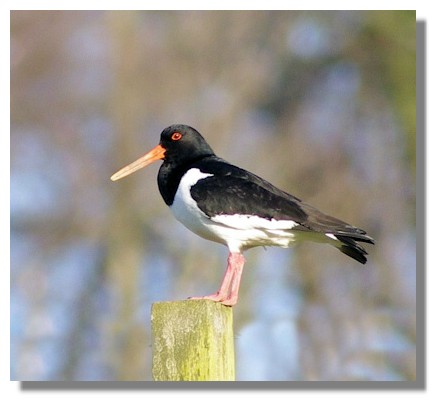 Oystercatchers usually fly away when humans approach but this one was content to stay on a fence post while I took its portrait. They always look incongruous with those large orange-red bills - useful for digging up not just shellfish at the seashore but also worms inland in farmland. Their loud piping "kleep-kleep" call can often be heard long before they are seen. In winter, resident numbers of around 80,000 in the UK swell to over 340,000 as birds from Scandinavia migrate here.