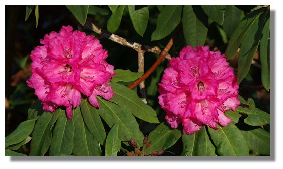As mentioned earlier, there was slight mist when we arrived but by the time we had reached the rhododendrons the sun was slanting through the trees and lighting up the blooms. Of course it was not all plain sailing - there were lots of trailing branches of brambles (blackberry) on the ground and progress was often held up when I got entangled in their sharp thorns!