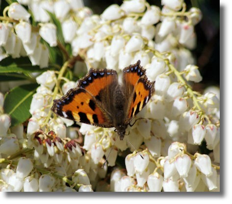 Butterflies of various varieties are often to be seen at Finlaystone, so it was perhaps no great surprise to find this Small Tortoiseshell fluttering amongst the Pieris flowers. The adult Small Tortoiseshell is striking, with its dark body and orange and black wings which have a row of blue dots around the rear edge. However, the underwings are dull, which helps to conceal stationary or hibernating individuals. When threatened, resting small Tortoiseshells rapidly open their wings, presenting the dramatic display of colours. This can frighten away young or inexperienced birds. The Small Tortoiseshell is found in most of temperate Europe and is abundant in most areas of the United Kingdom, including Scotland, but numbers vary each year. It also hibernates during the winter and so is usually one of the first butterflies to be seen in the spring along with other regular hibernators.
