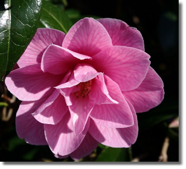 Camellias are evergreen bushes and small trees up to 20 meters (65 feet) tall. Their leaves are alternately arranged, simple, thick, serrated, and usually glossy. Their flowers are usually large and conspicuous, one to 12 cm (4/5 inches) in diameter. The colours of camellia flowers vary from white through pink to red (though there is apparently a yellow variety in South China and North Vietnam).