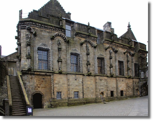 This is the inner hall of the palace where King James V and later his daughter Mary Queen of Scots would greet courtiers and visitors. At one stage, someone playing the part of one of Mary's staff explained to a party of school children how those presented to the Queen would have to bow and curtsy to the monarch and could not straighten up till told to do so by the queen. Apparently Mary sometimes amused herself by keeping everyone obeisant for several minutes!