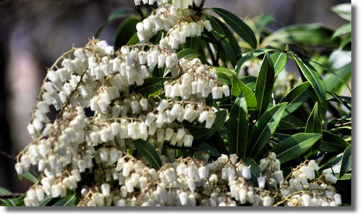 Pieris Forestii is grown mostly for its fiery red leaves which it produces each year but it also creates cascades of white flowers. Perhaps because of the mild winter we have had this year, it seems as though Pieris, not just in my own garden, but all over, has been particularly floriferous this year.