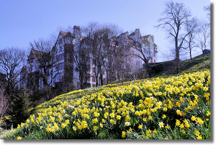 I worked in Edinburgh for 15 years so I'm very familiar with the vista of daffodils in Princes Street Gardens, below Edinburgh Castle (located to the right of this picture) and Ramsay Gardens, the "next door neighbours" of the castle. These buildings are a redevelopment built in the 18th century when there were no official planning controls, so it is a delightful mix of architectural styles, including an octagonal "Goose-pie" house built by Allan Ramsay the poet. There is also a beautiful spacious flat, with a panoramic 360 degree view, designed by Sir Patrick Geddes (regarded as the "father" of town planning). The slope faces north so is often in shade but I timed it about right on the day this photo was taken - particularly as the sun was shining brightly.