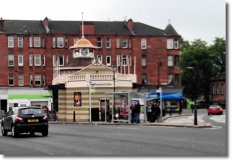 I know this "Battlefield Rest" very well as I went to school in the area from the age of 9 to 12. It is located at a road junction near the old Victoria Infirmary and now the ultra modern New Victoria Hospital occupies the site of the former Queens Park Secondary School. The Battlefield Rest was built as a transport shelter for the tram drivers and conductors and its exterior is tiled in the (then) Glasgow Corporation Transport colours of green and cream. It opened in 1915 and there was a well used news kiosk. The interior featured a huge mural of Glasgow Corporation Transport. It lay empty and unused for many years and was under threat of being demolished but got a new lease of life as a restaurant in the early 1990's.