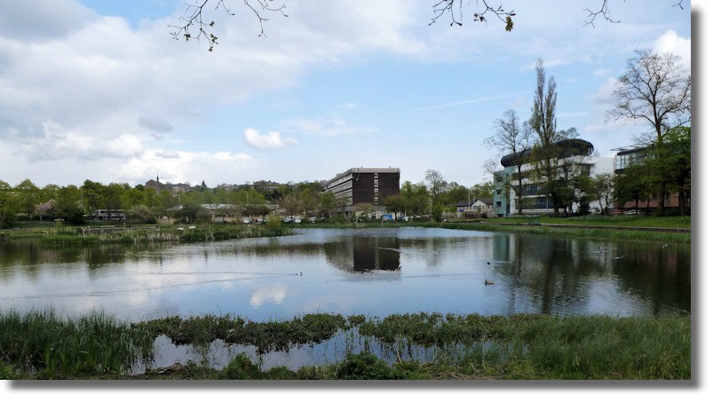 Bingham's Pond is just over a low wall from Great Western Road, one of the busiest arteries in Glasgow. For a long time it was a neglected area, but a pond naturalisation project was carried out in 2003 by the city's parks department. It has been transformed into a wildlife haven, with water birds happily breeding there for the first time and with damselflies and aquatic plants thriving. That's the Pond Hotel in the middle of this picture and to the right are buildings forming part of the huge Gartnavel General Hospital which serves the whole of north-west Glasgow