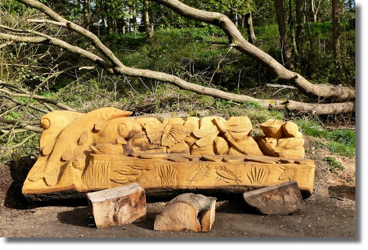 The storms in January brought down a lot of trees and most of the wood was chopped up to be used as logs or turned into woodchips. But some of the fallen trees around our local Kilmardinny Loch have been transformed instead into sculptures by some enterprising and skilled woodsman. The most ambitious carving is this large seat decorated with all sorts of wildlife found in this woodland area, including a fish, a butterfly. a dragonfly and a frog!