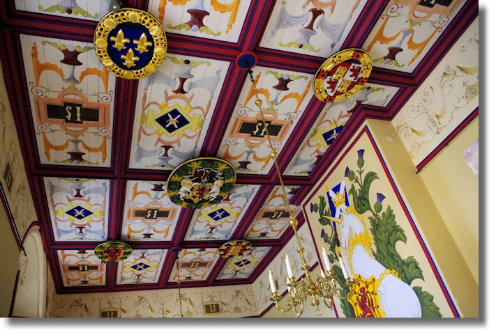 This is the ceiling of the newly refurbished Palace within Stirling Castle. The room was used as the bedchamber by King James V and alternating panels on the ceiling have his royal cipher "I5" - the letter "I" comes from Iacobus, the Latin form of James. Other designs on the ceiling record the investiture of James into the great European chivalric orders such as the Golden Fleece (Burgundy). St Michael(France), the Garter (England) and the Scottish heraldic thistle. The overmantle to the fireplace is decorated with a unicorn, adopted by Scottish kings as a symbol of purity and strength. Elsewhere in the palace at Stirling there are reproductions of tapestries incorporating representations of more unicorns. The pillars on each side of the fireplace have thistles carved on them. Somewhat disappointingly, it is thought that the king didn't normally sleep in this ornate room but in a smaller side room.