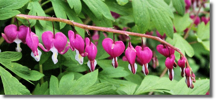 Dicentra (also known as bleeding-heart) is a genus of 8 species of perennial herbaceous plants in the fumitory family, many with heart-shaped flowers, native to eastern Asia and North America. The flowers are on leafless stalks. which grow in an arch from the base each year.