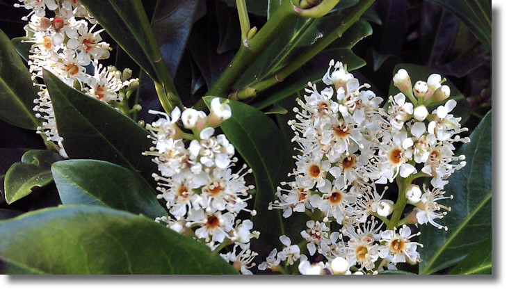 This Belgian Laurel was planted soon after we moved into our present house so it has been growing for over 25 years. It has spread to a bout ten feet high and over ten feet wide. The white spikes of its flowers contrast very well with the dark green of its evergreen leaves.