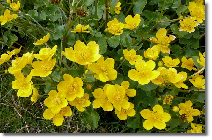 As their name implies, Marsh Marigolds (Caltha palustris or Kingcup) are usually found in wet, marshy ground, ditches and wet woodland in temperate regions and is a herbaceous perennial of the buttercup family. So it was no surprise to see large numbers of them at Bingham's Pond. It becomes most luxuriant in partial shade. In the UK, it is probably one of the most ancient British native plants, surviving the glaciations and flourishing after the last retreat of the ice, in a landscape inundated with glacial meltwaters. Other names found for this plant in the UK are Mayflower, May Blobs, Mollyblobs, Pollyblobs, Horse Blob, Water Blobs, Water Bubbles, Gollins, Balfae (in Caithness) and the Publican.