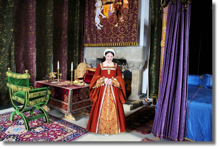 The Queen's bedchamber was next door to the king, with a huge four-poster bed, near the large fireplace (for those cold Scottish winters!). The walls were hung with rich, brocaded cloth of gold. These were hung on rings onto rods high on the walls, making it easier to take the hangings to another palace when the king and queen moved as they did on a fairly frequent basis between Edinburgh, Linlithgow, Falkland and Stirling. The lass in the red dress is not meant to represent the queen but rather one of her ladies-in-waiting