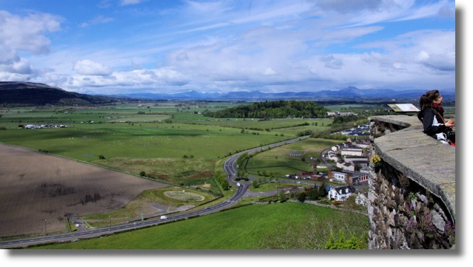 Perched on the top of a volcanic plug, Stirling Castle has great views of the surrounding valley of the river Forth. In the distance, to the north, is the Highland Fault Line, marking the start of the Highlands. Stirling has been described as the "brooch that pins the Highlands and Lowlands together."