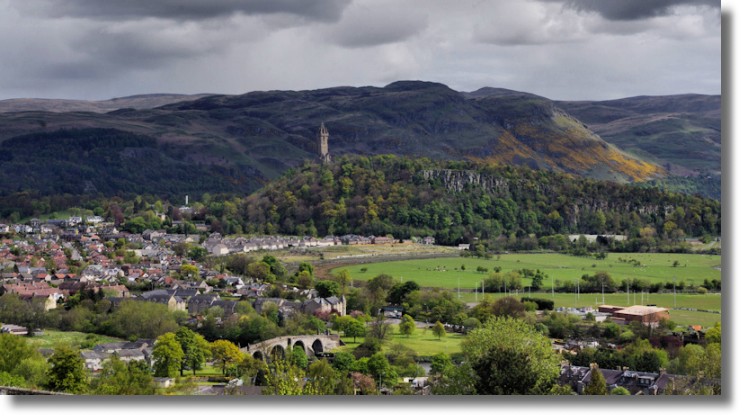 To the north-east of Stirling are the Ochill Hills and even near is Abbey Craig, with the Wallace Monument on its summit. Although not in this picture, the Ochil Hills are now scarred by a large wind farm complex which somewhat diminishes the grandeur of the southernmost edge of the Highlands.