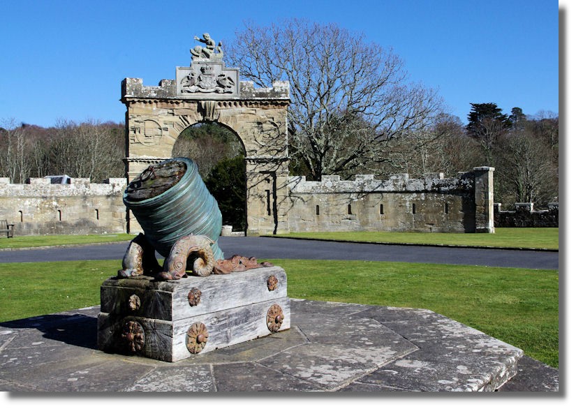 Culzean castle was built more as a stately home than as a defensive castle, so the need for canons and other items of medieval war equipment are not really required, but they still seem to appear on the lawns and entrances at such establishments. This small, "bombard" with decorative fish supporting the barrel is at the entrance gate to Culzean Castle. A bombard is a type of medieval cannon or mortar, used chiefly in sieges. The modern term bombardment derives from this.