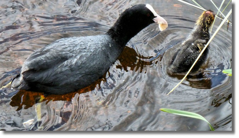 Unlike the Mallards, both coot parents are extremely attentive to their chicks and both race back and forwards constantly with more food. Being so young, these chicks were not very impressed by good quality wholemeal bread - but living in a public park in Glasgow, they'll quickly learn that bread is the birdie equivalent of McDonalds fast food.