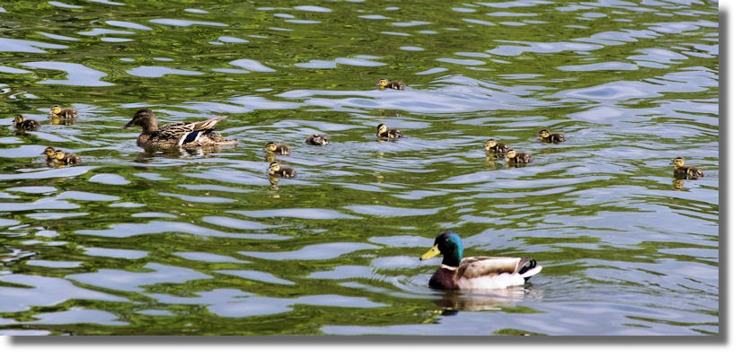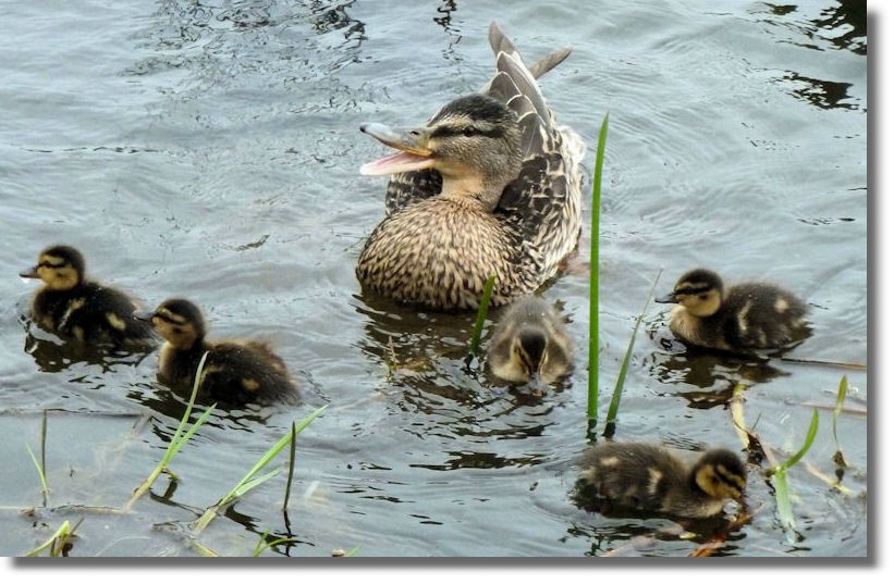 I always find it surprising that the mother Mallard is the sole parent to look after the youngsters. Indeed, just after this picture was taken, the female, with much quacking, rushed at an approaching male (who may even have been the dad). He tried to get away but she jumped on his back and pecked at his neck for good measure. He eventually escaped (or mum just decided to go back to look after her family). Despite being good at seeing off any threats, from the time they are hatched, mum Mallard never actually does any feeding of her offspring - just shows them where the best places to feed are located and they have to help themselves!