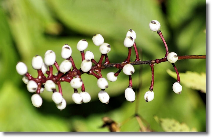 These are the berries of Actaea, commonly called baneberry or bugbane. This perennial plant is mainly grown for these striking berries - which, however, are highly poisonous. The plants grow to 2-3 feet and the small feathery flower spikes in summer are followed by these pea-sized berries in autumn. Actaea contains cardiogenic toxins than can have an immediate sedative effect on human heart muscle. The berries are the most poisonous part of the plant (hence the name baneberry). Children have been poisoned by eating the waxy, shiny red or white berries. Swallowing the berries can lead to cardiac arrest and death. It is toxic to rabbits but harmless to birds.