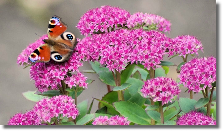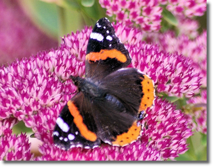This Red Admiral was spoilt for choice and flitted between the perennial wallflower and the well named sedum "Autumn Joy". Although the wallflower is almost over, this Red Admiral seemed to prefer it and I had to wait patiently for it to move to the sedum - I thought that made a better background for the picture! In northern Europe, it is one of the last butterflies to be seen before winter sets in. The Red Admiral is also known to hibernate (in Southern England, though, rather than in Scotland), re-emerging individuals showing prominently darker colourings than first brood examples.
