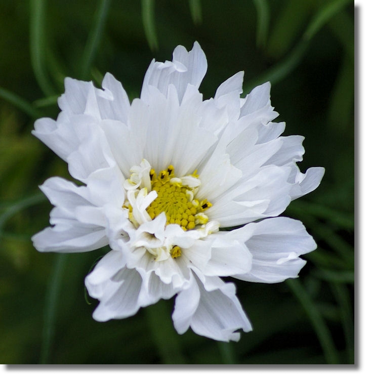 Cosmos originated in scrub and meadow areas in Mexico where most of the species occur, and in Florida and the southern United States, Arizona, Central America, and South America. These herbaceous plants grow up to 2/3 feet tall in a wide variety of colours. This white form is named Cosmos Seashells and has conical petals.