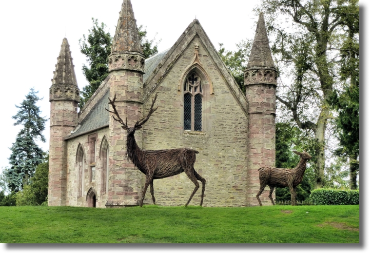 At first sight looking like real deer, the sculptures which have recently been added on the top of Moot Hill seem very realistic in this setting. Moot Hill was where noblemen of medieval Scotland swore allegiance to the king. A replica of the Stone of Destiny upon which the kings of Scotland used to be crowned is also located on this mound. The chapel behind the "deer" (woven from tree branches) commemorates David Murray, 1st Lord Stormont who helped to resolve a long-running, bitter feud between two of his friends, the Marquis of Tullibardine and the Earl Marischal in the early 16th century.