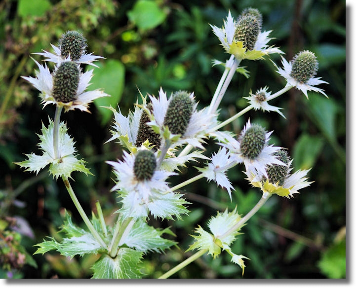Eryngium is a genus in the family Apiaceae of about 230 species of annuals and perennials with hairless and usually spiny leaves, and dome-shaped umbels of flowers resembling those of thistles. Some species are native to rocky and coastal areas, but the majority are grassland plants. Common names include Sea-holly and Eryngo.