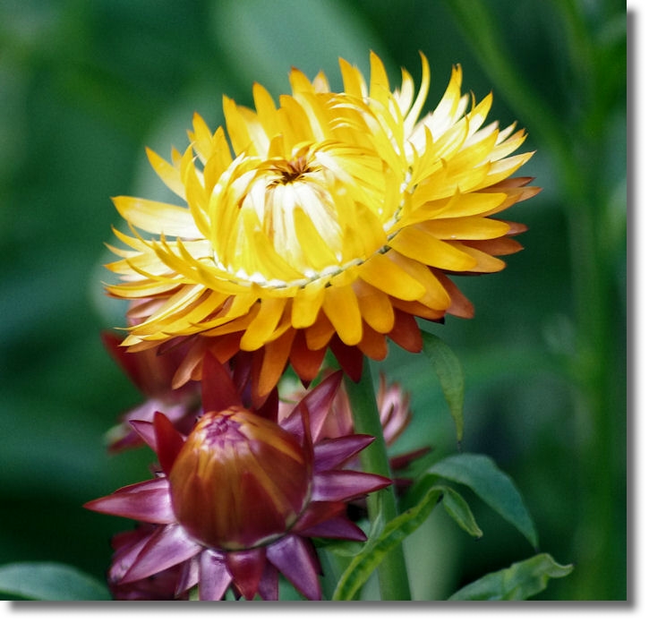 Helichrysum consists of an estimated 600 species, in the sunflower family. The name is derived from the Greek words helisso (to turn around) and chrysos (gold). It occurs in Africa (with 244 species found there), Madagascar, Australasia and Eurasia. They can be in almost all colours, except blue. In addition to being attractive plants in the garden, one of their features is that when cut young and then dried, the open flowers and stalks preserve their colour and shape and can be kept in a vase for long period, certainly over winter.