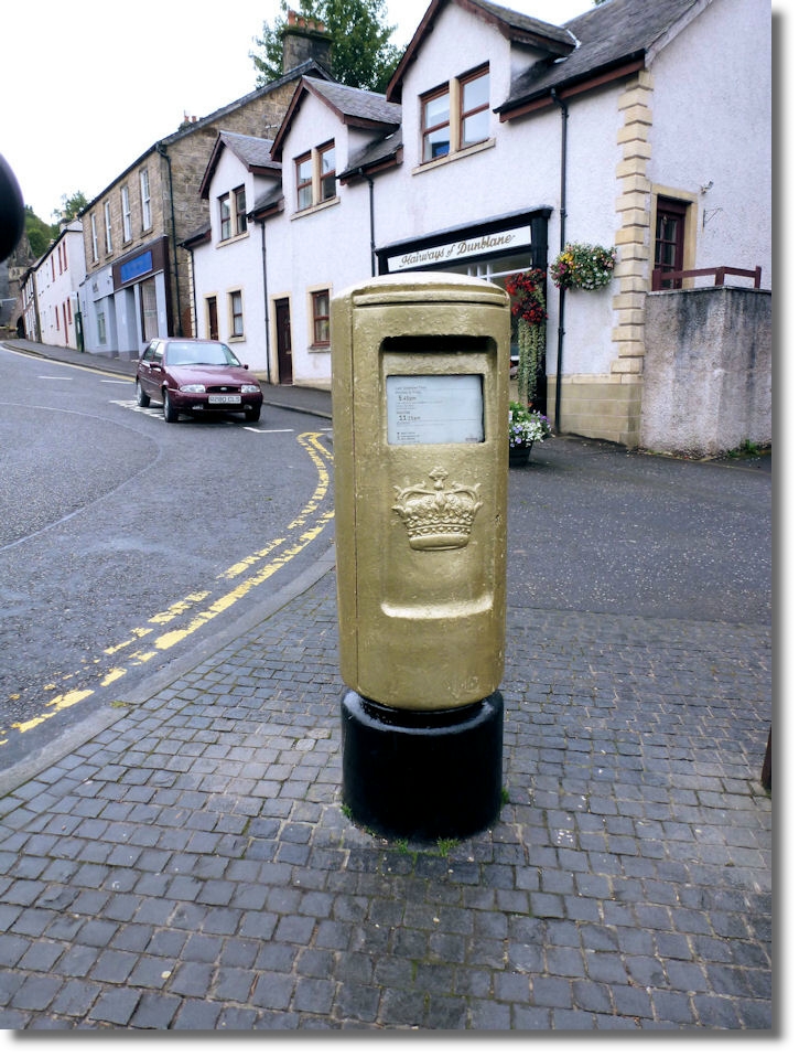 The gold painted pillar box is within sight of Dunblane Cathedral, pictured here. Dunblane (fort of Blane) is named after St Blane, who is believed to have been a Briton from the kingdom of Strathclyde who was educated in Ireland before 600AD. Blane is said to have been given a dun or fort as a place to build his monastery, near the Allan Water which flows through Strathallan to the north. A stone church (earlier ones may well have been made of wood) was built in the 12th century. Little remains of this building but the lower four floors of the tower was built around the time of King David (1124-1153).