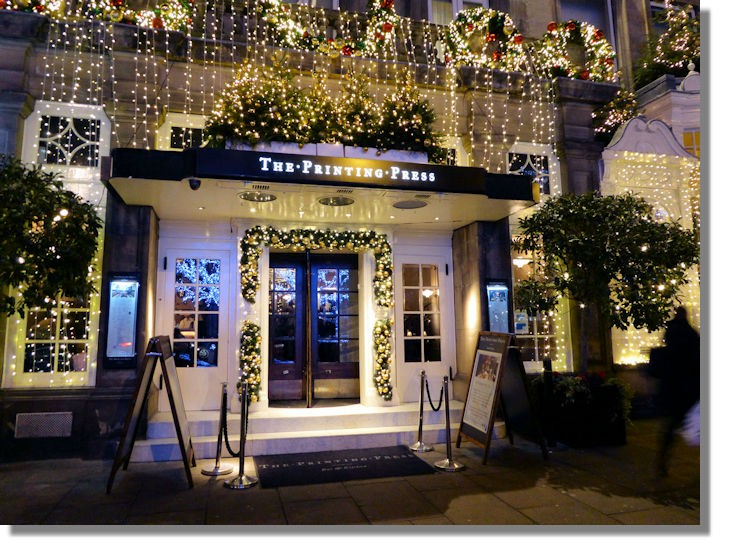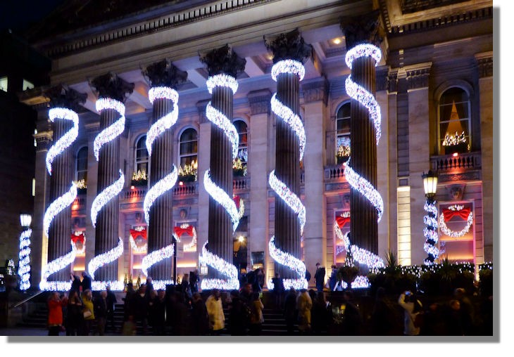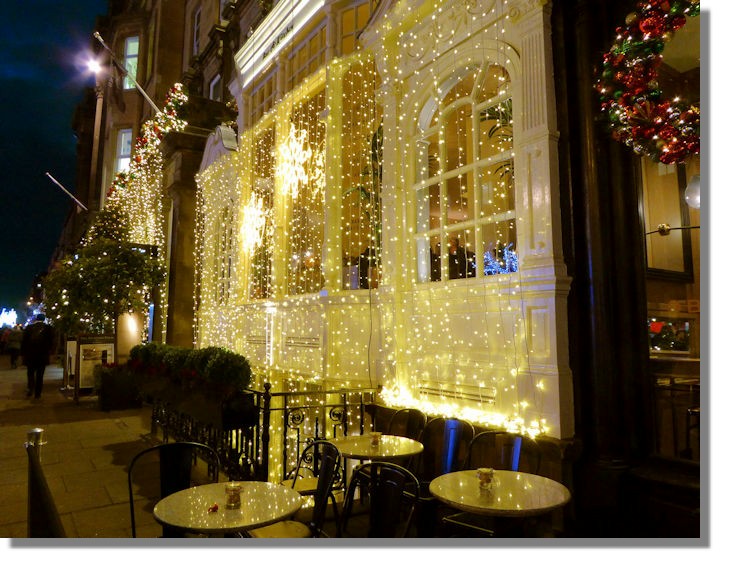Originally a branch of one of the Scottish banks, this building never had Christmas decorations like these round its neo-classical columns - now the "Dome" restaurant and bar.
