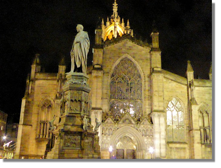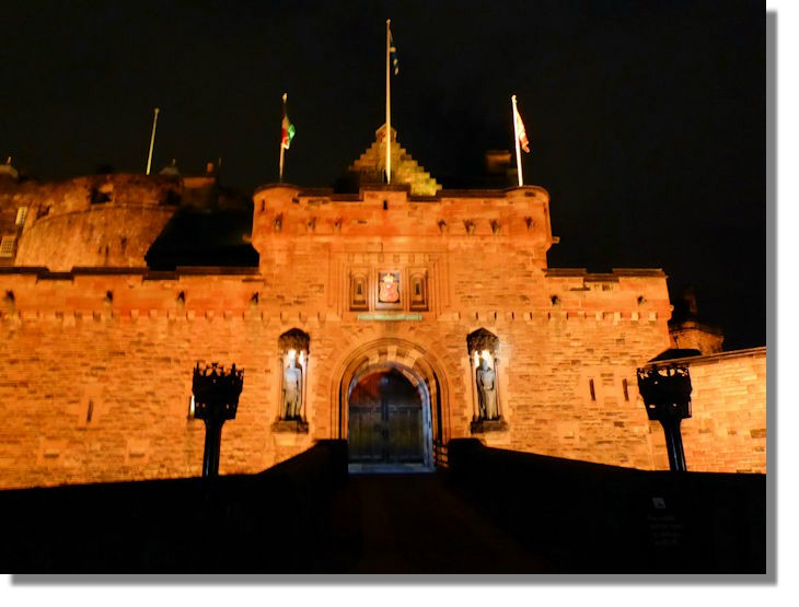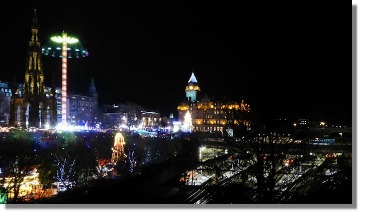 Beyond Princes Street Gardens lies the Balmoral Hotel (with its clock traditionally kept two minutes fast to encourage intending travellers to hurry up if they were a bit late for their train!). The lights in the right foreground are from some of the platforms in Waverley Station. Built in 1846, I sometimes wonder if the railway company had to apply for planning permission today to run a railway line through Princes Street Gardens, below Edinburgh Castle, what the answer would have been? As it was, even in Victorian times the line had to stop at Haymarket, short of the Princes Street Gardens. It was only later that planning permission was granted for the extension with a deep cutting to disguise its presence (smoke in the days of steam trains was a bit of a give-away!)