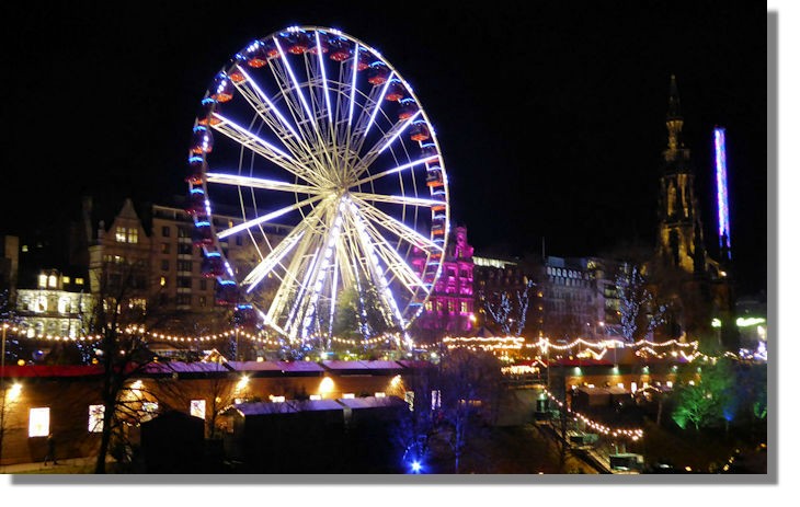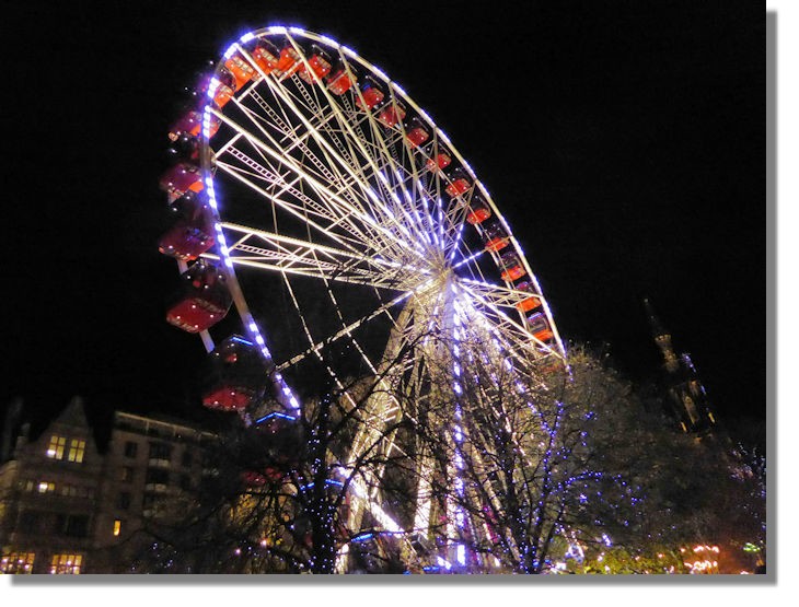 The Ferris wheel close by the Scott Monument is 42 metres (nearly 140 feet) tall, the wheel has 27 rotating Gondolas to take the passengers for a unique view over the city.