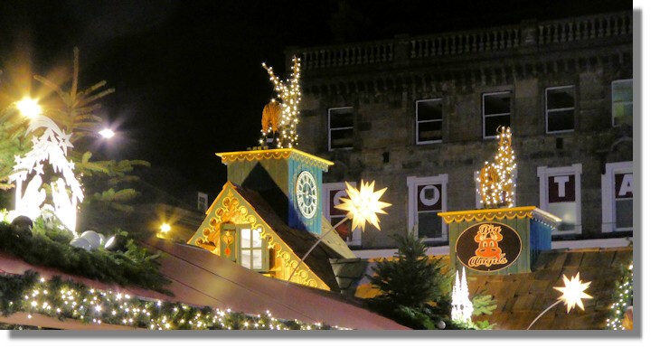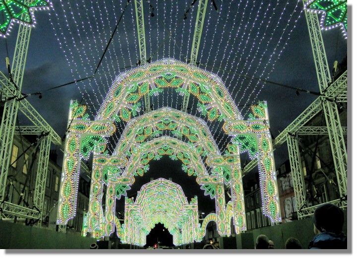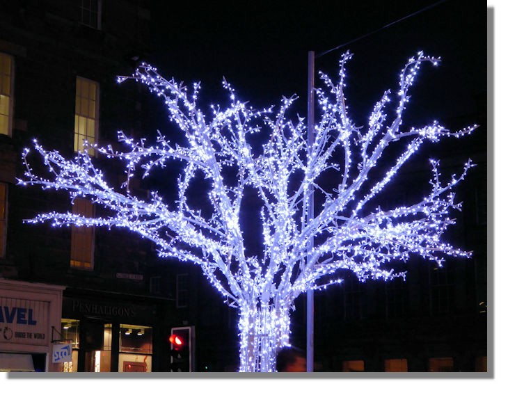The previous "Street of Light" installation on the Royal Mile was a disappointment as the lights only came on for a short time. In its new location in George Street its 60,000 lights created a stunning canopy of light and was impressive as soon as it got dark. At times, the lights were synchronised to music by choirs and musicians and there was a "Scottish Market with various stalls selling food and souvenirs.