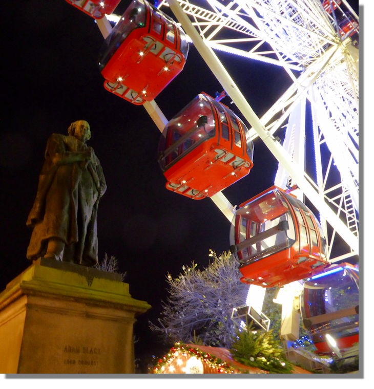 While looking for an interesting angle for a picture of the Ferris Wheel I noticed the statue of Adam Black who was twice Lord Provost of Edinburgh in the 19th century overshadowed by the wheel. I wondered if he would have approved of the commercialisation of the city in this fashion. But as a founder of the A& C Black publishing company which produced the 7th to 9th editions of the Encyclopaedia Britannica, perhaps he would have been very much in favour!