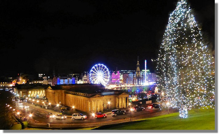 While there are other parts of central Edinburgh that have major lighting displays it is Princes Street Gardens which has grown over the years into the centre-piece of the Christmas lighting displays. Running along Princes Street, the main retail shopping centre in the city and overlooked by Edinburgh Castle, with the Scott monument (which often think looks like a Disney castle), the giant Ferris wheel, the merry-go-round, "Santa Land", the European Market and - in recent years - the "Sky Flyer" whirling its screaming passengers round high in the sky, there are sights and sounds for all! At 200 feet high, however, the Scott monument rises above them all.