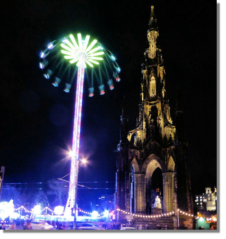 The Scott Monument with the white Carrara marble statue of Sir Walter underneath shows up quite well but the "Star Flyer" modules became a blur as they sped round.