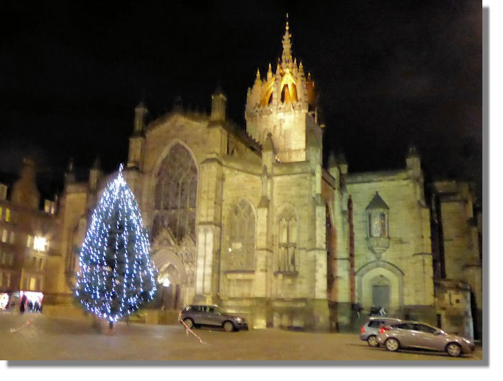 St Giles Cathedral on High Street is always floodlit at night in the winter months but the addition of a decorated Christmas tree adds to the Festive air.