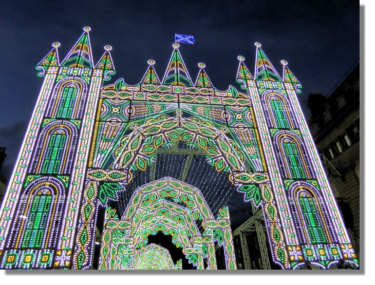 There are 24 arches each 19 metres (62 feet) high covered in a total of 60,000 bulbs. The lights were accompanied in the evening by taped music from local choirs and bands including the Edinburgh Festival Chorus, Royal Scottish National Orchestra Junior Chorus, Blazin’ Fiddles and Scotland’s very own bhangra group Tigerstyle.