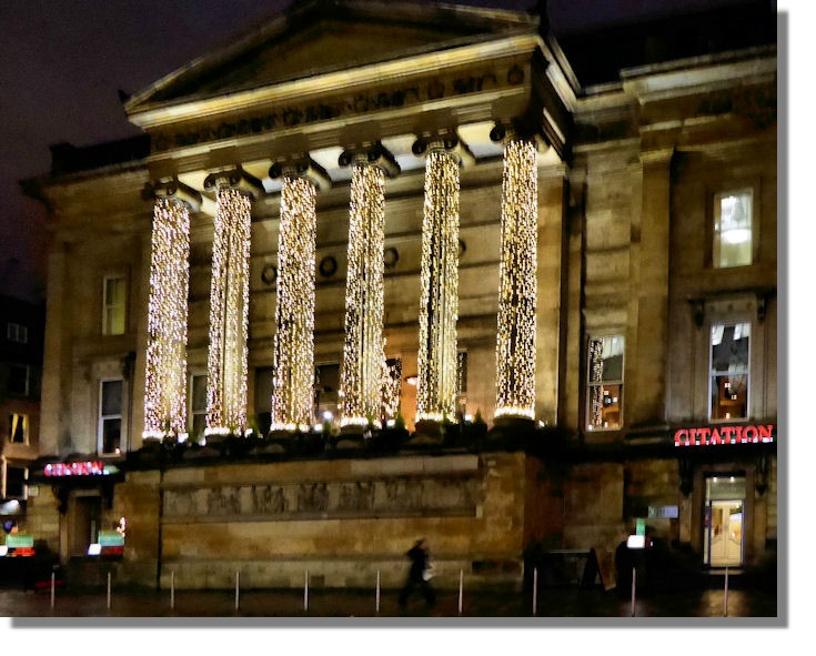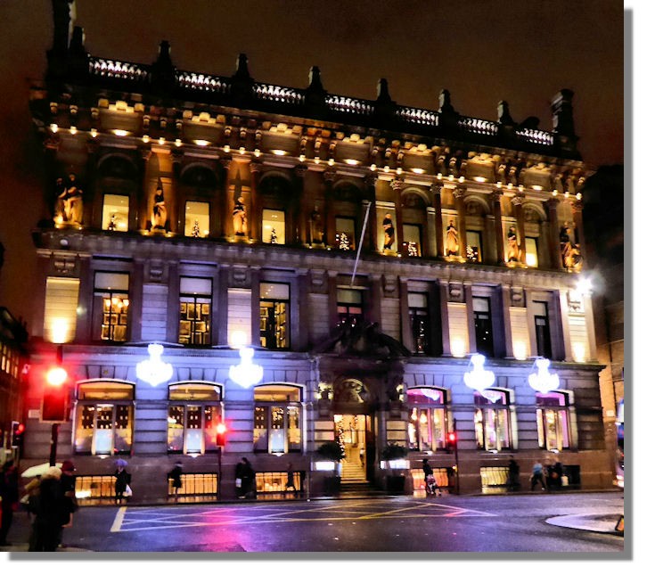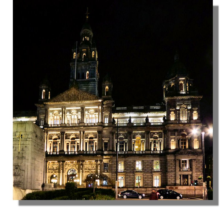 Glasgow City Chambers(roughly equivalent to the "Town Hall" is usually lit up during the winter months, not just at Christmas. It was opened by Queen Victoria in 1888 on her second visit to the city. When she had visited 39 years earlier, she disliked the city so much she said that she would prefer not to return!