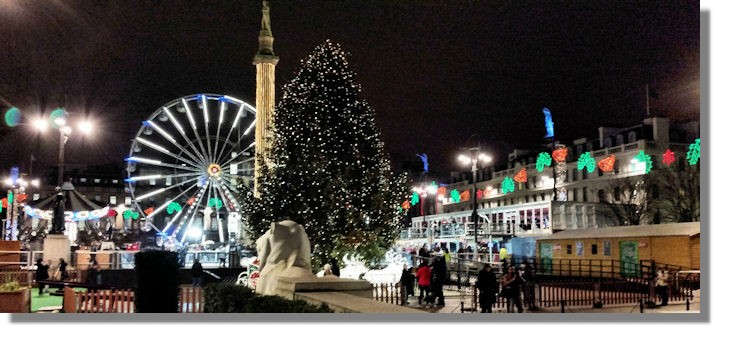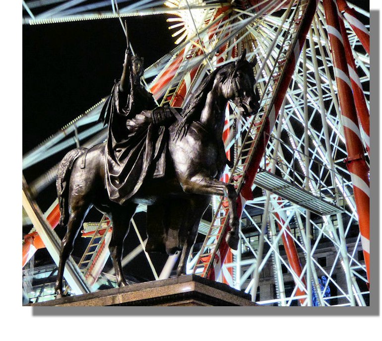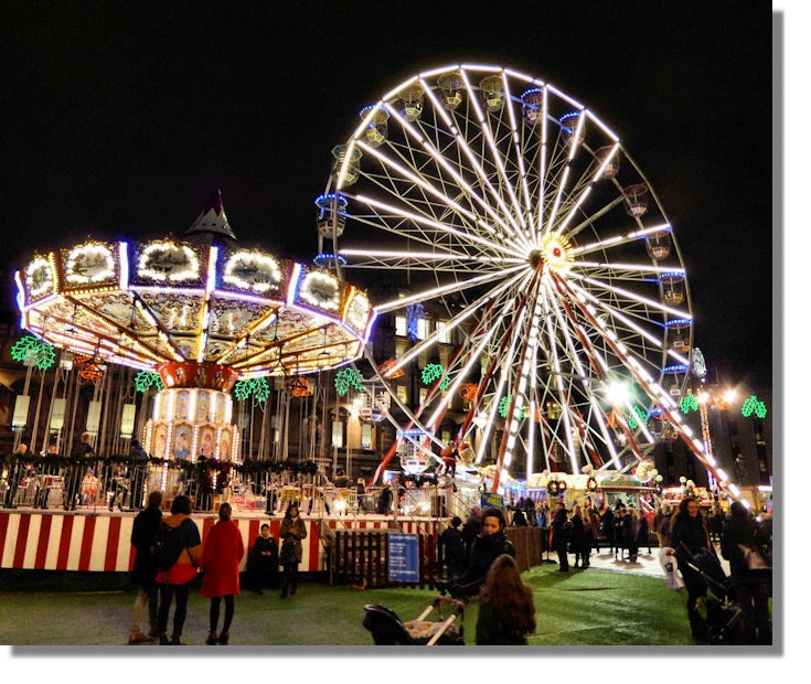 This overview of the Christmas lights in George Square includes the merry-go-round on the left, the Ferris Wheel, the column supporting the statue of Sir Walter Scott, the large Christmas Tree, the lights representing Santa's reindeer and some of the lights which were strung from the lamp-posts. The ice rink is just visible below the Ferris Wheel.