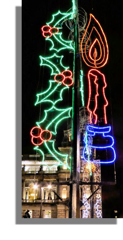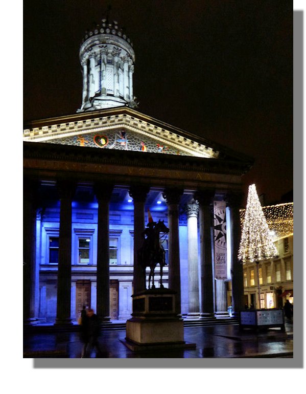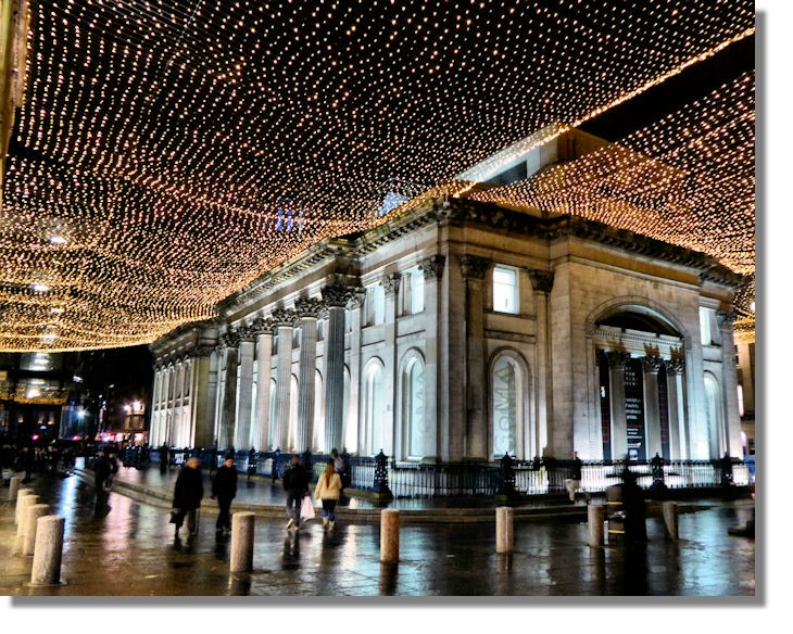 I never go anywhere in Scotland without my camera and I take photographs wherever I go. Sometimes I go somewhere specifically to take photographs with a view to adding another page to the Rampant Scotland site. On other occasions I just see something that makes an attractive picture or else it's another graphic to add to the library to perhaps use on a future occasion. It thus forms a pictorial diary of my travels during the month which can be shared by everyone!This is a selection of photographs I took in central Glasgow of the Christmas decorations and buildings lit up at night. There is a commentary on each one.
